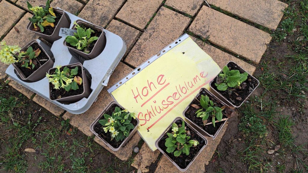 Im Vorfeld wurde bei der Staudengärtnerei Spatz jeweils 60 Exemplare von zwei Primelarten bestellt, der Echten Schlüsselblume (Primula veris) und der Hohen Schlüsselblume (Primula elatior). Beide Arten haben unterschiedliche Ansprüche. Im Unterschied zur blassgelben Hohen Schlüsselblume, die schattige Standorte mag, bevorzugt die Echte Schlüsselblume mit den kräftig-gelben Blüten eher sonnige Stellen in Halbtrockenrasen und Wiesen. So wurden auf dem ÖBZ-Gelände zunächst passende Standorte ausgewählt, auf den hausnahen Wiesen und deren schattigen Randbereichen. So fanden sich im Schatten der Haselnuss-Gehölze, sowie auf dem Wiesenstück entlang einer eher sonnen beschienenen Hangkante geeignete Plätze.