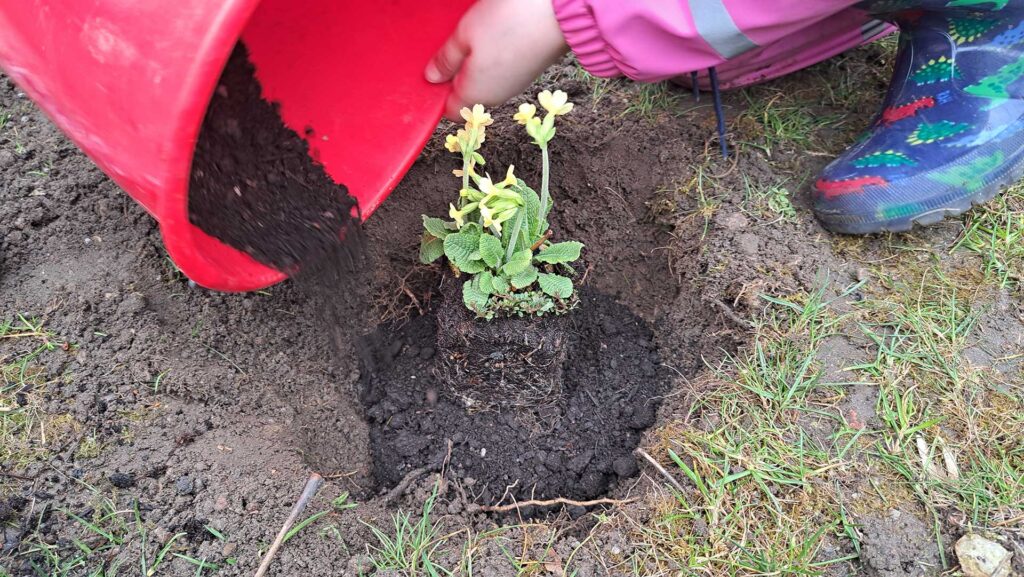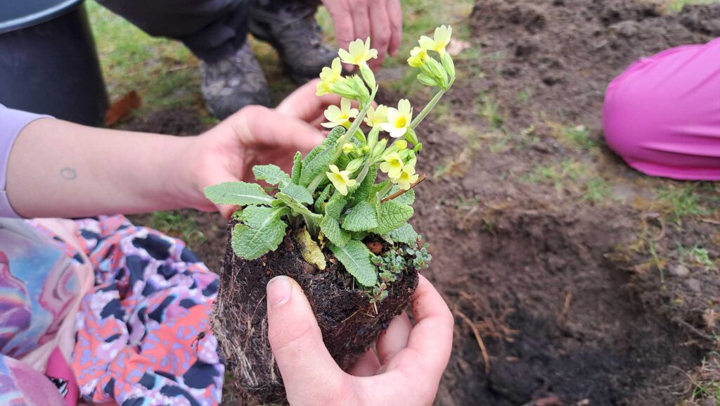 Bei der Pflanzaktion am 19. und 26. März 2025 waren insgesamt sechzig Kinder unter Anleitung von Elisabeth Öschay und Renate Luz vom ÖBZ eifrig dabei. Teamarbeit war angesagt. Während die einen die Pflanzen und das Substrat vorbereiteten, haben andere mit dem Spaten die Pflanzlöcher ausgehoben. Alleine das Graben war für die Kinder schon ein tolles Erlebnis, wenn sie Regenwürmer entdeckten oder sie auf eine Wurzel, die sich unter dem Gras ausgebreitet hatte, stießen. Am Ende waren alle stolz, was sie gemeinsam geschafft haben: Eine hübsche Primelwiese, von der sie wissen, dass sie nicht nur attraktiv aussieht, sondern auch ein Beitrag für mehr biologische Vielfalt am ÖBZ ist. Denn – und auch das hat die Kinder beeindruckt – die beiden heimischen Primelarten bieten Nahrung für mehreren Wildbienenarten, für Schwebfliegen und für mehr als 20 Raupenarten.