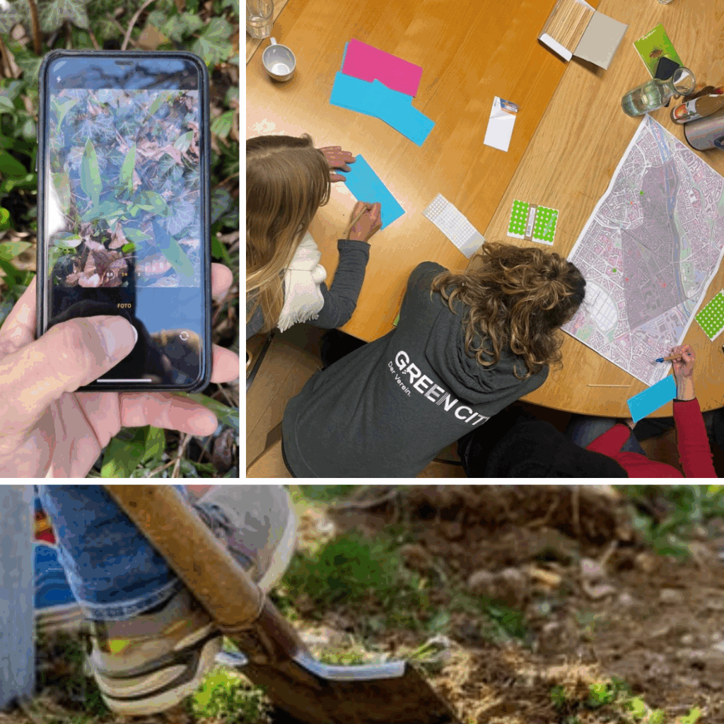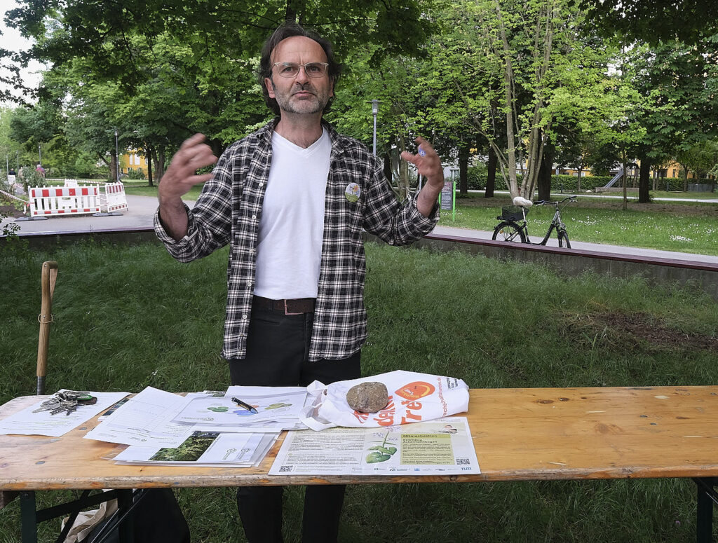 Eine wichtige Information gibt uns Konrad Bucher zuletzt noch: Anders als bei der Neuanlage eines Wildpflanzenbeets auf einer Rasen- oder Wiesenfläche, darf man unter Bäumen nicht fräsen oder tiefreichend umgraben. Die Gefahr, das wertvolle Wurzelnetz der gestressten Stadtbäume zu beschädigen ist zu groß. Deswegen werden wir in mehreren Schritten die Fläche vorbereiten und erst im Herbst pflanzen. Dies hat auch den Vorteil, dass die zarten Jungpflanzen beim Anwurzeln keinem Hitze- und Dürrestress ausgesetzt werden.