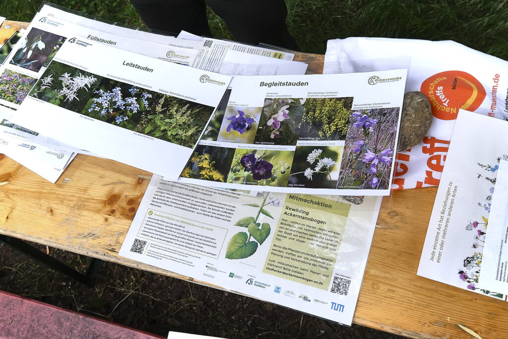Das erste Treffen für die Planung des Dreieck-Beets am Ackermannbogen fand am 20. Mai 2025 vor der etwas verwilderten Fläche beim Speisecafé Rigoletto (Rosa-Aschenbrenner-Bogen 9) statt. Konrad Bucher vom BioDivHubs-Projekt erzählte uns vom Planungsprozess, den die Verbundpartner Münchner Umweltzentrum (MUZ) und TU München zusammen mit den Expert*innen vom Bund Naturschutz (BN) jetzt schon für die zweite größere Beetanlage durchgeführt haben: