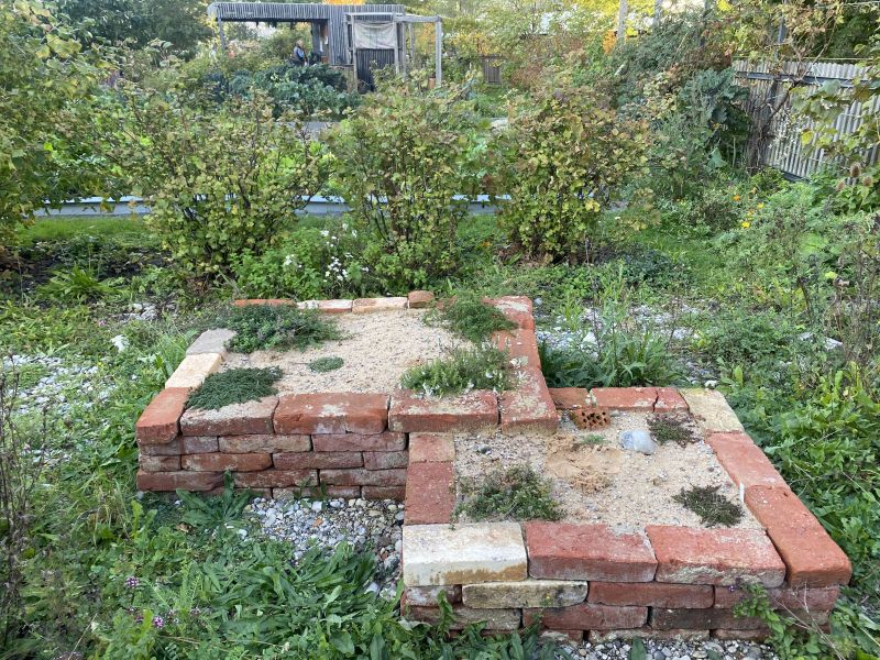 Aus gebrauchten Ziegelsteinen bauten die Gärtner:innen zwei Hochbeete, die mit wenig Pflanzerde und viel Sand befüllt wurden. Die Ecken wurden mit verschiedenen Wild-Thymianarten bepflanzt, deren Blüten vielen Wildbienen begehrte Nahrung bieten. Der mittlere Bereich der Hochbeete bleibt frei. So kann sich der Thymian konkurrenzfrei ausbreiten – und die Wildbienen finden genügend offenen Boden für ihre Nistplätze.