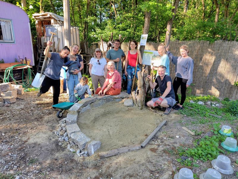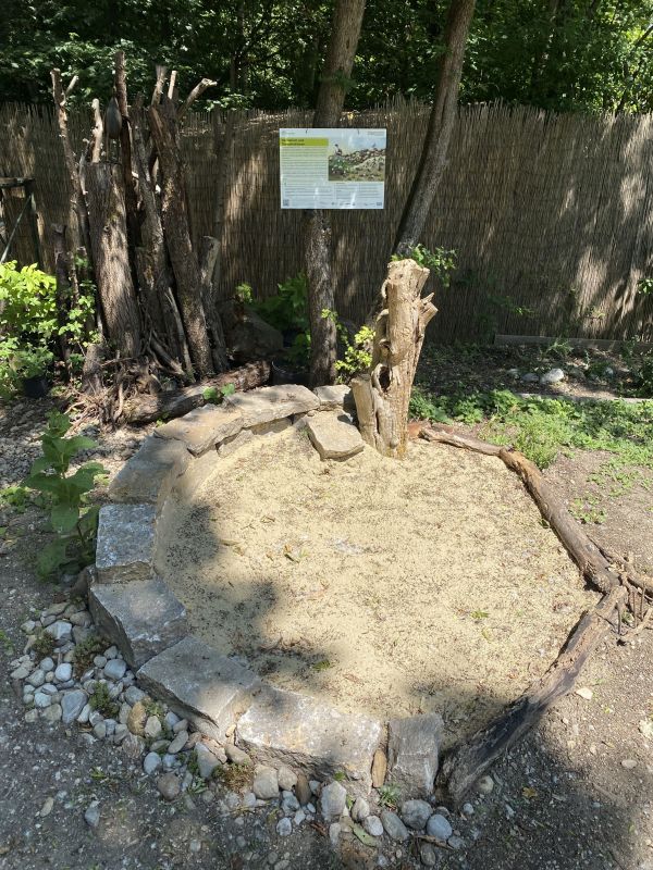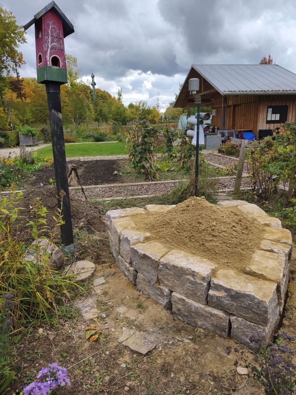 Im Jahr 2025 fanden in mehreren Studiengärten, die sich im BioDivHubs Projekt beteiligen, Workshops zum Bau von sogenannte Sandarien statt. Dabei handelt es sich um trockene, vegetationsarme und gut besonnte Sandflächen, die gezielt als Nistplatz für Wildbienen und andere Insekten angelegt werden. Oftmals in Kombination mit Trockensteinmauern, bieten diese Strukturen Raum zum Nisten und die Möglichkeit zu überwintern. Die Vorteile dieser Sand- und Steinstrukturen sind vielfältig: Steine speichern die Wärme der Sonne und geben sie nachts langsam wieder ab, wodurch ein ausgeglichenes Mikroklima entsteht.